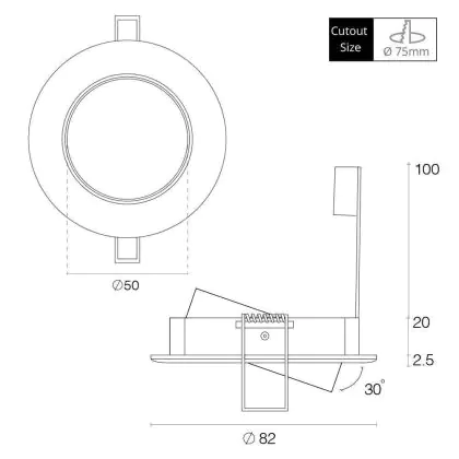 Any Lamp Recessed Spot Circular Tiltable Aluminium | Cutout 75mm - GU5.3 Socket est un spot LED encastrable. Ce luminaire est conçu pour un éclairage d’accentuation pour un usage domestique ou bien professionnel. Fixture Retrofit, ce spot LED Lumi Parts en Aluminium a besoin d’une place nécessaire de 75mm de largeur et mm de profondeur. Ce luminaire est compatible avec une ampoule GU10, il est important de faire attention si vous décidez de changer d’ampoule.